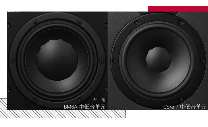 銅質音圈更重,振動質量更大,配合較薄的振膜能夠具有較低的諧振頻率和較大的振動質量,獲得強勁有力的低音效果,兼顧控制力與下潛度。而鋁制音圈更輕,控制力更好,配合較厚的振膜使Core的中音單元有著細膩精準的表現——畢竟,我們的聽覺對中音最敏感,而且中音含有的聲音細節也最多。Core 59的中音頻段為385 Hz – 5k Hz,Core 47的中音頻段為475 Hz – 5.25k Hz,與傳統設計相比,Core三分頻監聽具有更寬廣的臨界人聲,確保在混音過程中更自信地處理聲音平衡和對白細節。