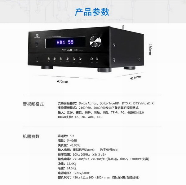 AT-2180是一款定位于年輕一代發燒友的具有極高性價比的全景聲影K一體功放,集家庭影院系統、個人音樂中心和專業卡拉OK功能于一體的高清影音中心機。支持Dolby Atmos全景聲和DTS:X沉浸式音效,支持4K視頻技術,兼容3D、HDR、Dolby Vision等視頻格式;支持U盤、TF卡本地播放,支持APE、FLAC、WAV等多種無損音樂格式;支持藍牙無損傳輸和APP操控,海量音樂隨時可享;5.1.2專業數字卡拉OK 功能,打造您的專屬私人KTV;840W優質巨型環牛提供源源不竭的動力,為高保真音質筑基。是一款可全面滿足您高品質視聽唱感受的高清影音中心機。