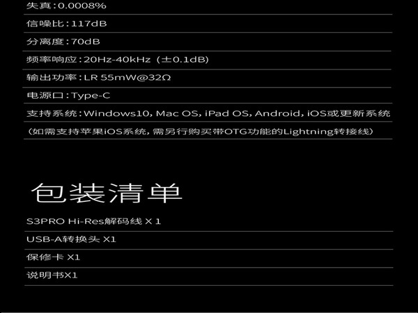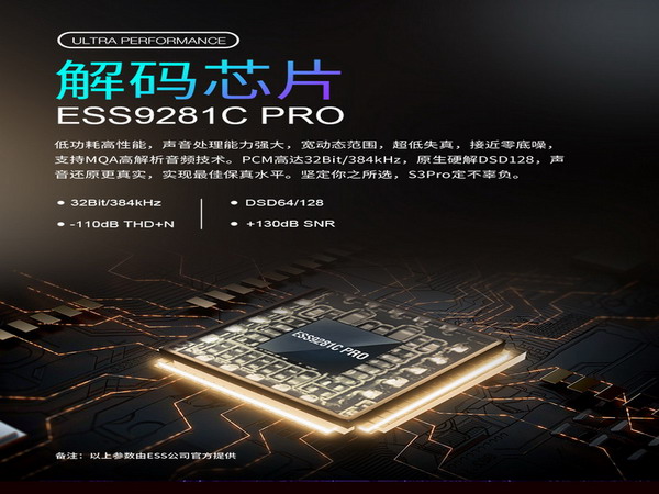 S3PRO自帶轉(zhuǎn)接線,真正做到即插即用。除了實用性,它的音質(zhì)也是不在話下,4顆松下電容讓小小的身體聚集了強大的力量,搭配ESS9281CPRO解碼芯片,低功耗,高性能。更是支持MQA X8倍展開。