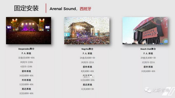 Arenal Sound音樂節現場,舞臺兩邊掛著巨大的橫幅,橫幅上寫著:D.A.S音響系統將在今年的Arenal Sound音樂節上大放光彩。約300,000名觀眾來到Burriana的Arenal沙灘參加此次為期5天的活動。此外,每年音樂節呈現的佳作都涵蓋了多種音樂類型,有流行音樂、搖滾樂、鐵克諾音樂和浩室音樂等。演唱會和演出分別在三個不同的舞臺進行,其中兩個舞臺安裝了D.A.S音響系統。