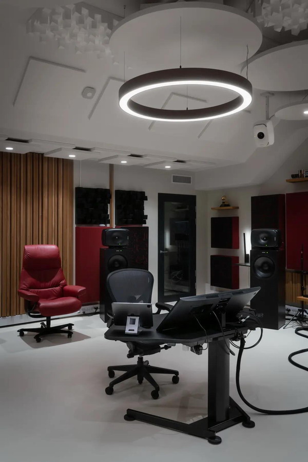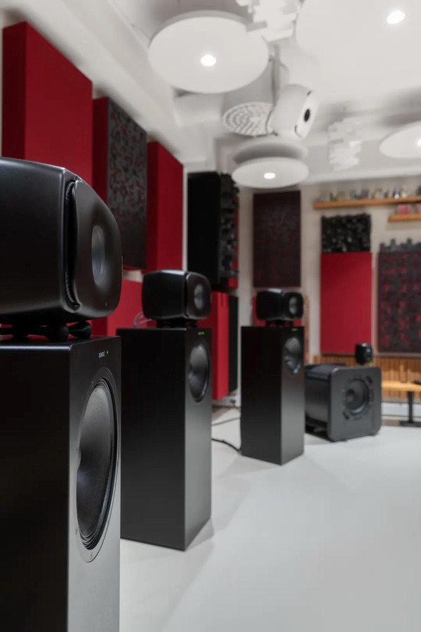 這間工作室是專門為沉浸式音樂的編輯、混音和母帶制作而設計的。監聽系統兼容杜比全景聲(Dolby Atmos)和 Auro-3D,在音箱的選擇上也花費了心思:包括 7 只 8351B 同軸三分頻音箱,并且每一只都配合了 W371A 自適應低音系統;頂部音箱選用 4 只尺寸更緊湊的 8341A 同軸三分頻音箱;LFE 聲道由一只 7380A 超低音箱負責重放。