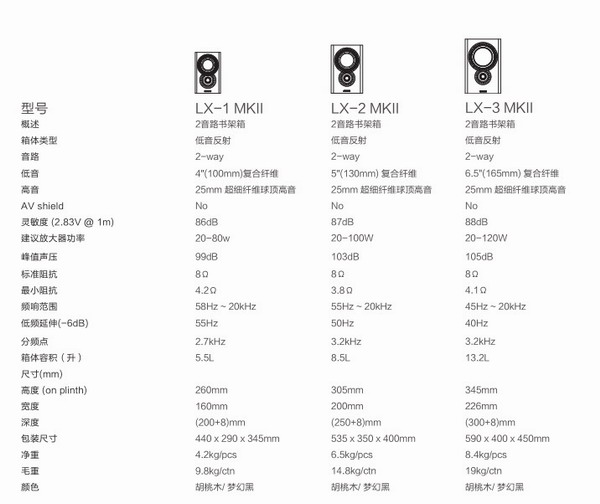 全新的LX-MKII系列提供了豪華黑色和經典的胡桃木色,LX MKII系列包括九個型號:三款書箱(LX-1 MKII,LX-2MKII,LX-3 MKII),三款落地箱(LX-4 MKII,LX-5 MKII,LX-6 MKII),兩款中置(LX-C1 MKII,LX-C2 MKII)和一個3D環繞揚聲器(LX-3D MKII環繞)。