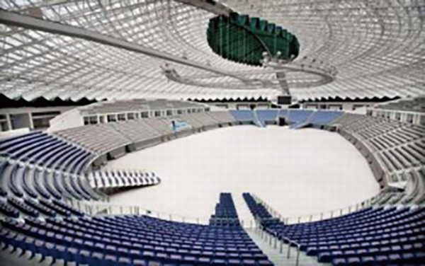 該館比賽大廳呈橢圓形,廳內最大高度42.39 m,有效體積約為331 021 m³,內表總面積約38154.62㎡(無活動看臺時),相應觀眾席位有18 000人,每座容積比約18.4 m³,體積界面比為8.58,場內平均自由程為34.7 m。其建聲設計在控制調整混響時間的同時,重點考慮消除回聲和長延遲反射聲,為擴聲系統創造一個良好的建聲環境。