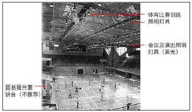 對于不設固定舞臺的營業性大中型體育館,各類演出活動一般都是由承辦方臨時搭建燈光系統,體育館只需做好配電、承重和安裝條件等內容設計即可。