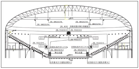 因此,其揚聲器布局應適當參照劇場的規范,在舞臺口頂部設置主揚聲器、在舞臺兩側設置拉聲像揚聲器、在臺口附近設置舞臺返送(監聽)揚聲器等。如受資金的制約,最低限度的要求也必須在舞臺口兩側設置主揚聲器。