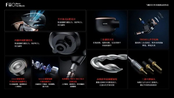 我們來總結一下兩圈兩鐵入耳式耳機FH5s的特點。兩圈兩鐵全新架構、12mm鍍鈹低頻大動圈+6mm鍍鈹中頻小動圈+樓氏30017復合動鐵單元組合、半開放的聲學后腔設計、隱藏式內循環前腔調音孔、三位調音開關、標配四股120芯單晶銅鍍銀線、標配三款可換插頭...從配置、配件、音質上相對FH5都有全面的提升。