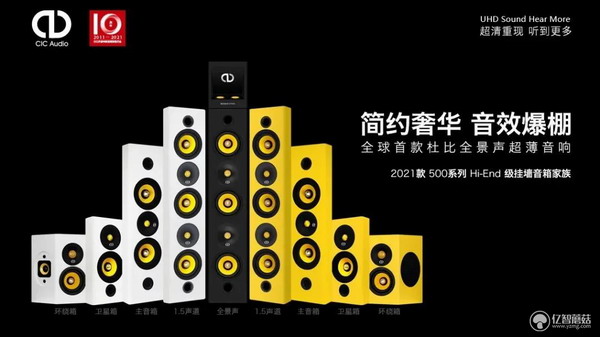 這次展出的2021年CIC推出500掛墻系列,不僅在外觀上,做到了全球最薄的音響,6厘米的實際厚度,4厘米的視覺厚度。烤漆工藝,黑白黃三個顏色。同時首次提出讓中置有聲無形,解決了中置無處安放的尷尬。CIC首次把絕對菲思分頻器運用在中置結像中,突破了中置的聲場問題,并且讓聲場不會固定在一個位置上,實現整個空間的中置效果。更適應時下最流行的激光電視的擺放。無需再為中置的擺放位置而煩惱,準確的聲音結像讓傳統的中置音箱徹底消失,卻神奇般留下了完整的中置聲場。這款音響之所以能夠稱得上后裝的跨界產品,還有一個原因是把環繞聲做到前面,市場唯一一款掛墻款模塊化真實環繞組件產品,杜比專利技術,聲學透鏡式原理,不是模擬環繞聲,而是真實的獨立環繞音響,通過最適合客廳的吊頂反射(墻面反射不適合客廳),形成環繞包圍音效。