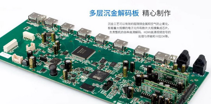 精益求精——卡拉OK信號處理 隱藏在解碼板、藍牙模塊、信號輸出板下方的還有一塊卡拉OK信號處理電路板。天逸沿用其極其擅長的專業卡拉OK處理技術,移植于天逸的專業數字音頻效果器AD-208,采用獨立的數字32bit DSP聲場處理芯片,可提供前/后各兩路獨立的卡拉OK話筒輸入,滿足多人共同嗨歌。無論是數字解碼效果還是多級防嘯叫功能,都非常到位。且產品具備影/K一鍵切換功能,使用極其方便簡單。
