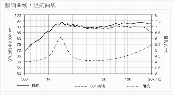 MT121高音采用1寸特殊涂層蠶絲振膜,搭配25mm直徑鋁音圈和強有力的釹鐵硼磁鐵,靈敏度高達92.5dB,極為易推。得益于優秀的振膜材料和聲學設計,它可以在1625至2萬3千赫茲頻段內回放出自然平順的高頻。從測試數據可以看到,MT121的頻響曲線無論在軸向,還是離軸30度下都有非常平順的頻率響應,可以提供優秀的聲場還原。
