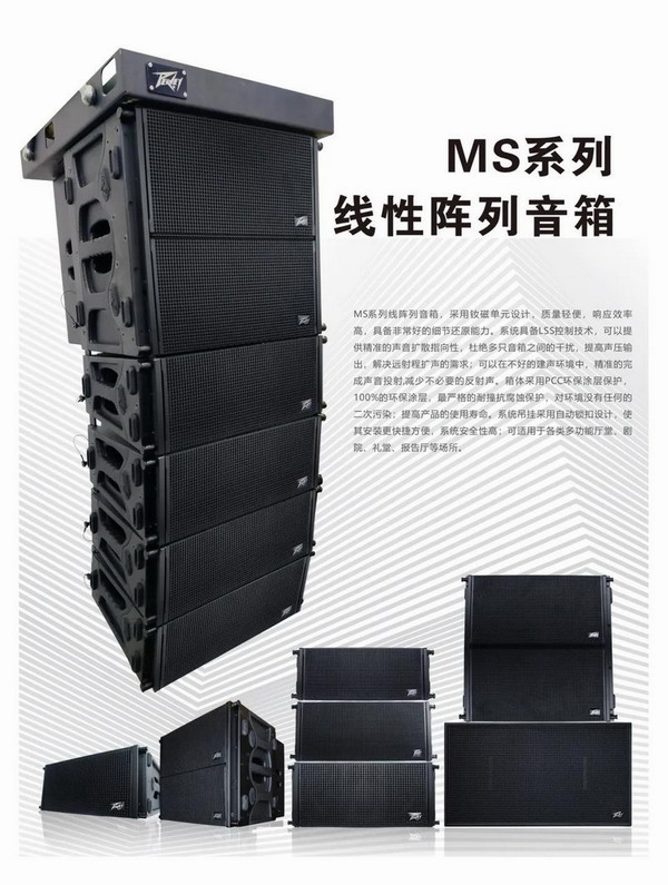 MS系列線陣列音箱,采用釹磁單元設計,質量輕便,響應效率高,具備非常好的細節還原能力。系統具備LSS控制技術,可以提供精準的聲音擴散指向性,杜絕多只音箱之間的干擾,提高聲壓輸出,解決遠射程擴聲的需求;可以在不好的建聲環境中,精準的完成聲音投射,減少不必要的反射聲。 箱體采用PCC環保涂層保護,100%的環保涂層,極其嚴格的耐撞抗腐蝕保護,對環境沒有任何的二次污染;提高產品的使用壽命。系統吊掛采用自動鎖扣設計,使其安裝更快捷方便,系統安全性高。