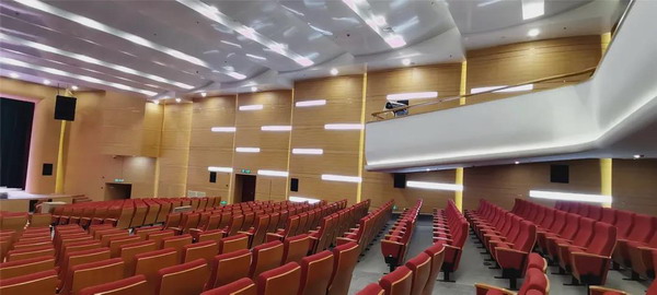 由于該禮堂還作為觀影需求設計,在廳堂池座兩側各分布了4只環繞音箱,樓座兩側各分布了2只環繞音箱,均采用Impluse10R通過專業的電影解碼器,經Peavey強大的媒體矩陣MediaMatrix nion nE進行通道整合與分配,完成了觀影模式下的一鍵控制,不再需要繁復的調音臺音量匹配、模式切換,即可將所有聲道的音源各行其道地分發到指定的音箱里去。