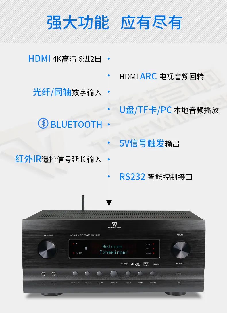 想在強者林立的品牌競爭中擁有一方天地,那么就得有相應(yīng)的實力。慕強時代的來臨,別人的高配,是天逸的標(biāo)配。天逸AT-2000是一款11.2聲道的全景聲影K功放,采用7.2.4解碼,獲得并通過Dolby Atmos(杜比全景聲)、DTS:X(沉浸式音效)、HDMI 2.1技術(shù)認(rèn)證,支持4K超清視頻格式,輕松獲得專業(yè)級的家庭娛樂視聽體驗。支持手機APP連接、藍(lán)牙無損傳輸、U盤/TF卡本地播放,特有9.2.2卡拉OK系統(tǒng),性能強大,操作簡單。是一臺集家庭影院系統(tǒng)、HiFi音樂中心、專業(yè)卡拉OK于一體的“影音超級中心機”。