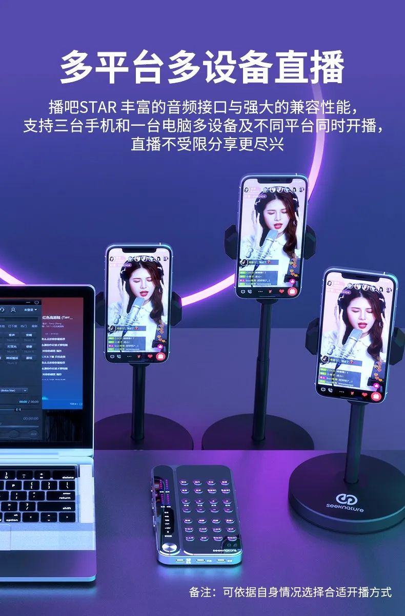 支持3臺(tái)手機(jī)+1臺(tái)電腦,同步開(kāi)播,支持各大主流直播平臺(tái),一臺(tái)聲卡滿(mǎn)足你的多平臺(tái)直播需求!