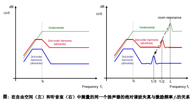 揚聲器的傳統諧波失真測量不僅可以揭示其非線性癥狀還包含了聲場輻射和傳播、聲學環境(如房間)以及傳感器(如麥克風、激光)屬性等線性傳遞特性影響。比如房間,它就像一個線性后置濾波器,在房間諧振頻率fr處會增強所有的信號分量,使得聲壓響應的基波分量在fr處產生一個峰值,而相應的n階絕對諧波失真分量則在fr/n頻率處產生峰值。