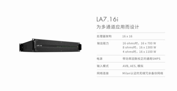 LA7.16i功放控制器通過兩個網(wǎng)絡(luò)接口支持最為可靠、最高質(zhì)量的可冗余備份Milan AVB協(xié)議。用戶可以在Ambiance項(xiàng)目中,直接搭配使用L-ISA處理器2代和LA7.16i功放;或使用P1 AVB混音處理器連接;或搭配任何支持Milan協(xié)議的第三方設(shè)備。