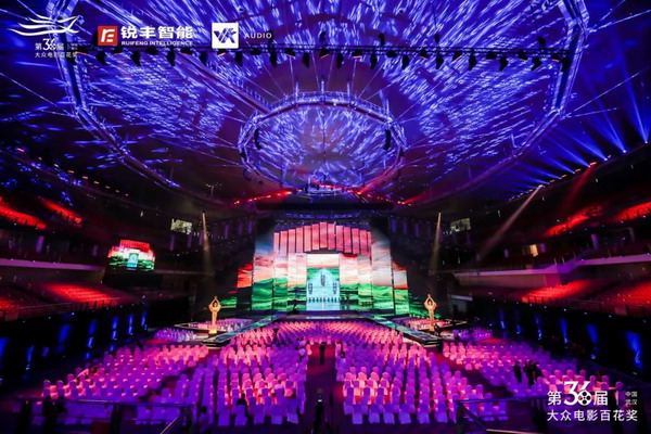 本次盛典選址在武漢體育中心體育館舉行,體育館地上五層,可容納13000名觀眾。設計為三面觀眾看臺的大型舞臺擴聲系統,聲場均勻度是系統設計及調試的一大挑戰。既要展現電影片段回放觀影的真實聽覺體驗,又要提供震撼有力的音樂體驗;確保電影人物對話清晰易懂,讓每個表演節目在聽覺與視覺效果融為一體。