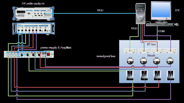 藍牙耳機一拖四音頻測試首先測試耳機的喇叭特性,聲音信號從音頻分析儀A4產生通過藍牙盒無線傳輸給待測耳機,人工耳采集到待測耳機的聲音信號通過功率放大器傳回音頻分析儀的模擬輸入端,音頻分析儀通過掃頻信號分析喇叭的聲學性能;下一步測試耳機的麥克風性能,音頻分析儀模擬輸出端輸出測試信號經功率放大器放大后推動人工嘴發聲,待測耳機的麥克風采集到信號并傳回至音頻分析儀輸入端進行分析,從而得出其各個性能參數。