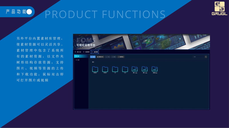 另外平臺內(nèi)置素材庫管理,使素材資源可以靈活共享。素材管理中包含了系統(tǒng)所有的素材資源,以文件夾樹形結(jié)構(gòu)存放資源,支持圖片、視頻等資源的上傳和下載功能,鼠標(biāo)雙擊即可打開圖片或視頻。