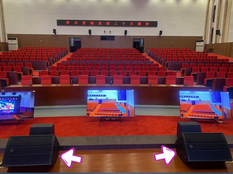 環(huán)繞聲道音箱:因?yàn)樵搱龅孛娣e較大,為了保障每一位觀眾都能聽到,我們配置了12只同軸音箱,均勻安裝在報告廳中后場墻壁上。