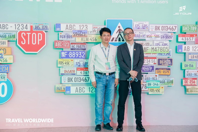 捷途品牌事業部營銷中心副總經理王陽與合作伙伴在捷途世界車牌故事墻前合影留念