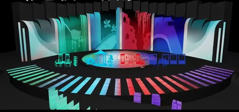 在舞美上創(chuàng)新的360度舞臺,對于燈光老師確實極大的考驗。不過這種特殊的舞臺方式,也是基于場地的承重吊點不夠的弊端,所以才采取了在室內(nèi)做室外演出的燈光結(jié)構(gòu)方式。用起雷爾結(jié)構(gòu)的方式,盡量減少對于吊點的需求。視頻舞臺、燈光舞臺互為對方的面光結(jié)構(gòu),左右視頻的燈光結(jié)構(gòu)又互為舞臺的耳光結(jié)構(gòu)。這樣在場地條件苛刻的情況下,知其不可為而為之,反而做出了特殊的效果。而且在很多演出中會遇到燈光與視頻內(nèi)容打架,要不就是燈光搶了視頻畫面,要不就是視頻強制壓制了燈光,現(xiàn)在索性將兩個大表演空間純粹化,也給兩邊的表演方式提供了新的思路。