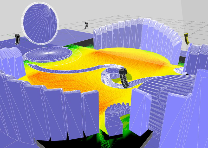當(dāng)音響團隊接到2024龍年山東春晚的總效果圖的時候,看到整個舞美設(shè)計方案,覺得此次的音響設(shè)計方案難度還是很大的。此次舞美設(shè)計是360度的舞臺,分為四個區(qū)域,主舞臺、燈光舞臺和兩側(cè)的年夜飯舞臺,以環(huán)形結(jié)構(gòu)視角進行呈現(xiàn)。主舞臺與燈光舞臺由龍行結(jié)構(gòu)的連廊連接。觀眾在四個舞臺中心位置,視覺上沒有一個舞臺聚焦點,聲像不好定位。