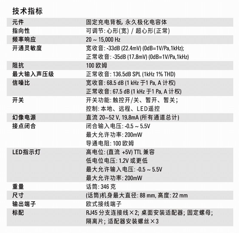 · 當與ATDM系列數字智能混音器配合使用時,利用超心形和心形指向性收音頭,可組合成圍繞話筒的360°收音