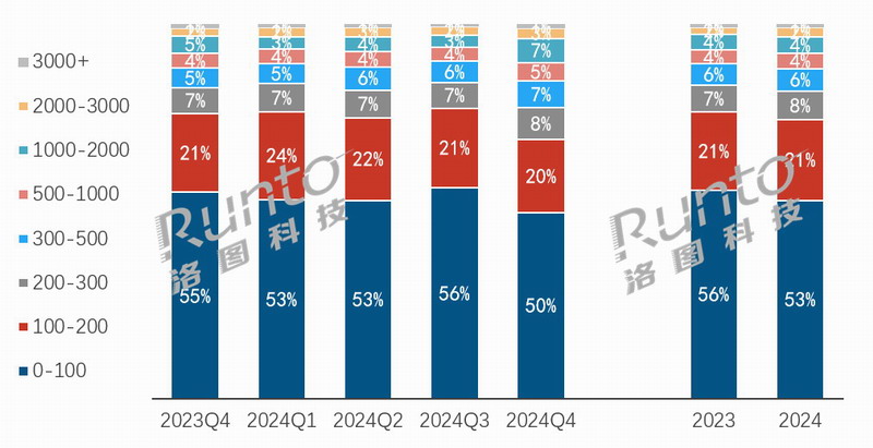 在線上監測市場,100元以內的產品銷量份額較2023年下降2.8個百分點,不過仍占據了半壁江山,達53.0%;在200元以上,除了3000+元之外,從200到3000元以內的各價位段銷量份額均實現了不同程度的小幅增長。