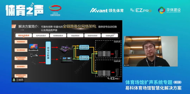 易科文體旅事業部解決方案經理王曉旸首先帶來《易科體育場館智慧化擴聲系統解決方案綜述》。他從當前我國體育場館擴聲系統的應用現狀出發,指出了目前擴聲系統在應用過程中的五大核心需求,進而提出了針對性的體育場館“5+1”擴聲系統解決方案,解決方案適配多元場景,為不同終端用戶提供多種選擇,兼顧性能與投入產出比。同時,解決方案聚焦各類使用場景的安全性需求,從系統備份、吊裝安全等多個層面為不同規模的場館量身定制高安全性擴聲系統。在聲場設計方面,王老師強調通過揚聲器系統的合理布局與合理選型的關鍵,從而獲得更高的聲壓級、更好的語言清晰度以及更高品質的還音質量。此外,他還詳細闡述了體育場館擴聲系統總控平臺ezCloud的設計需考量,幫助場館擴聲系統運維人員更好的對系統進行操作以及快速的故障排查,讓觀眾對體育場館擴聲系統有了全面認知。