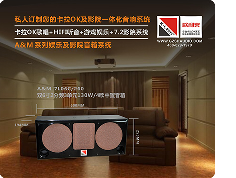 | A&M系列前主音箱A&M-7L10T/400,配置了1只10寸低音單體(中低頻表現優秀,120磁50芯,臺灣泡邊)+2只3寸中高音單體(高頻上限好,方形,雙磁,日本進口紙盆),高音經過多節定向分段擴音號角投射(如果是橫向吊裝,號角朝墻。建議使用400W~600W/8歐功率AB類功放推動。 | A&M系列的中置音箱A&M-7L06C/260,配置了2只6寸低音單體(中低頻表現優秀,100磁30芯,臺灣泡邊)+1只3寸中高音單體(高頻上限好,方形 ,雙磁,日本進口紙盆),高音經過多節定向分段擴音號角投射(如果是橫向吊裝,號角朝墻。建議使用300W~500W/8歐功率AB類功放推動。 |